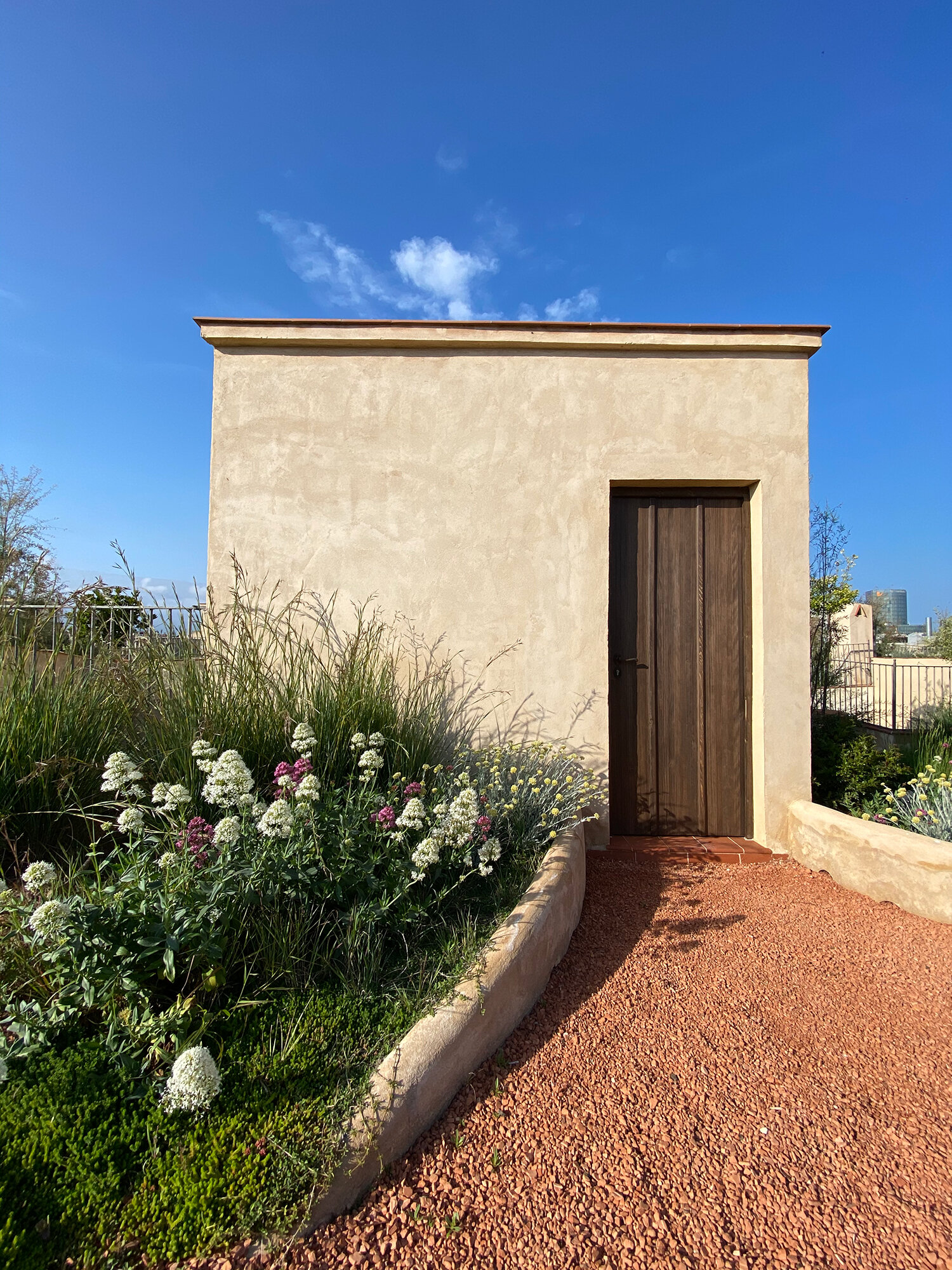 La elección de los materiales de construcción ha sido llevada a cabo de manera muy detallada con el fin de rebajar la huella de carbono y el impacto en el medioambiente de la obra. Uso de morteros de cal natural, materiales locales reciclados y reciclables, plantas de viveros locales, etc.